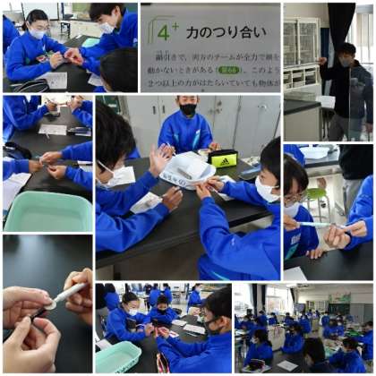 「力のつり合い」の学習です。二つの力がつり合うときの二つの力の関係を確かめるために、1円玉や50円玉をシャープペンシルや鉛筆を使って「ひじをつけてつり合わせる」「ひじを浮かせてつり合わせる」ことを体験しました。体験から分かったことを基に、一つの物体に二つの力がはたらいてつり合っているときの関係についてまとめました。