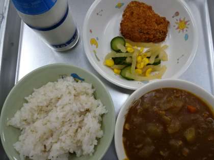 今日の給食は、麦ごはん、牛乳、カレーライス、カレイフライ、三色サラダです。
