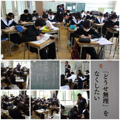 「『どうせ無理』をなくしたい」の学習です。仲間の発言を聞きやすいように座席を扇隊形にして授業を行っていました。