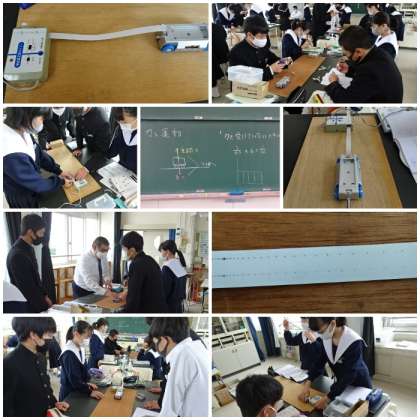 「力と運動」の学習です。力を受けていないときの物体の運動について調べました。台車にテープをつけ、台車を手でたたくように軽く押して進ませ、記録タイマーで運動を記録しました。手で押したあと、水平面上を進む台車の速さや運動の向きはどのようになったのでしょう?
