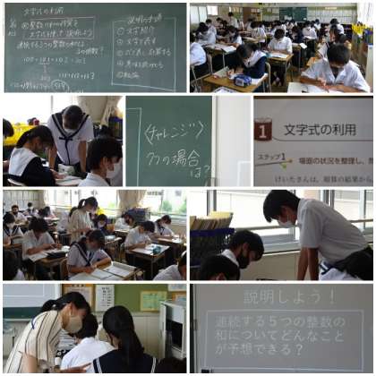 「文字式の利用」の学習です。学習課題は「整数の和の性質を文字式を使って説明しよう」です。例題として、連続する3つの整数の和は3の倍数であることを、一番小さい数をnと表し、順にn+1 、n+2の和がどのように表されるか考えました。その後、連続する5つの整数の和ならどうなるかを考えている場面です。教科担任は、「説明できた」生徒に対し、「7つの場合は?」とチャレンジ問題を出題します。「できた生徒」に飽きさせない工夫をし、できない生徒には「周りと相談していいよ」と告げていました。生徒は見通しを立てて問題を解決していました。