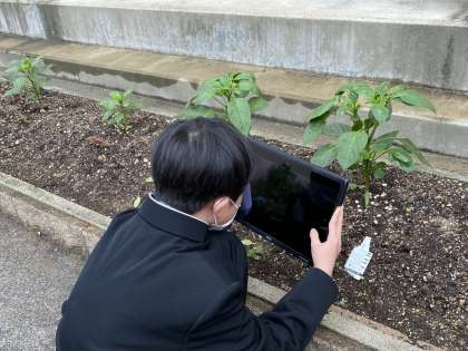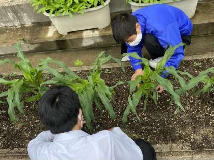 雨が奇跡的にあがったタイミングを見計らい、菜園作業を行いました。今年度は、トウモロコシ、トマト、パプリカを育てています。本時はわき芽を取る意味や支柱を立てる意味を学習しました。生徒を見ていると、熟練の農家のように、わき芽を取ったり、支柱を立てたりすることができています。今から期待でワクワクします。