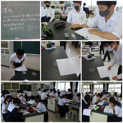 授業者は理科室にある器具と紙を使い、「静止している物体は、静止し続けようとする」という法則を、紙を引っ張り、器具がそのまま残る状態を体験させていました。