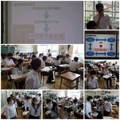 本時の学習課題は「第二次世界大戦は日本をどう変えたのか」です。「戦時下の国民の生活」に話が及んだときでした。授業者は、