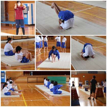 首のストレッチ、首の回転、手首のストレッチ、ゆりかご、ポンプ、ブリッジ、足の裏を併せてぐるんぐるん、カエル足パンパン、歩いて前転、こぶし後転、倒立