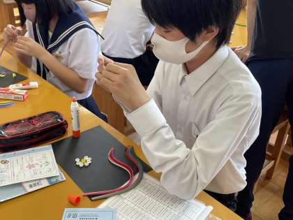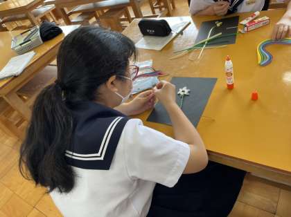 ペーパークイリングの作品づくりもだいぶ形になってきました。最初は友達と同じことをまねするだけだった生徒も、要領をつかんだら自分の好きな形のお花を表現するようになりました。左と真ん中の写真は同じ白いお花ですが、巻き取りの強さや花びらの形の違いで印象がだいぶ違いますね。
