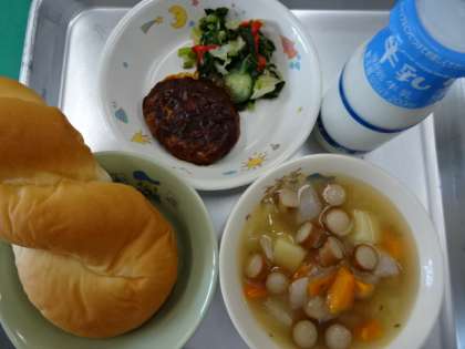 今日の給食は、愛知のツイストパン、牛乳、ハンバーグのデミソースかえ、江南玉ねぎのスープ煮、江南野菜サラダです。