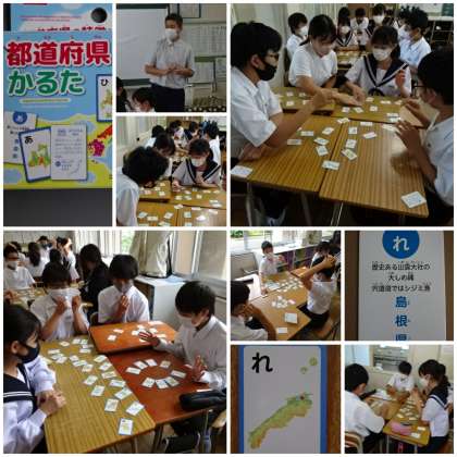 地理的分野の「都道府県」の学習を定着させるため「都道府県かるた」を行いました。読み札には「都道府県の特色」が書かれています。取り札には都道府県の形が描かれています。