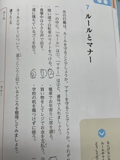 1年生の道徳「ルールとマナー」です。まず、教科書を用いてルールとマナーの相違点について考えたあと、教科書の内容ではなく、NHK for schoolの動画を題材にして、ルールとマナーの必要性について考えました。