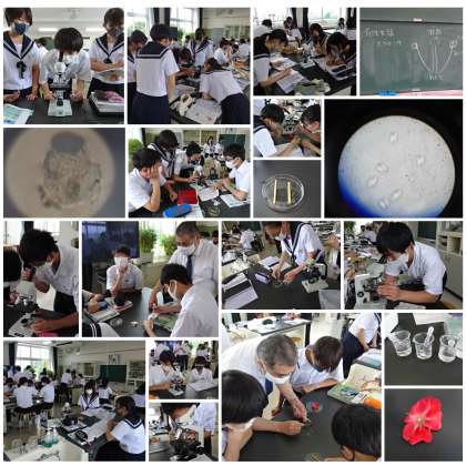 「生物の子孫の残し方」の学習です。本時は有性生殖にはどんな特徴があるのか、小学校で学習した無性生殖の特徴を基に考えました。また、植物が受粉したあとの花粉の変化を調べました。授業者は4月の初めにホウセンカを種から育て、今日の実験・観察に備えていました。