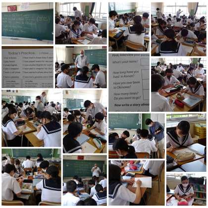 生徒にとっては5人の先生に囲まれての授業です。これまでに学習した現在完了形(She/He has lived in Konan for/since〜)の継続用法や経験用法を使って、グループの仲間にインタビューをして、聞きとった内容をワークシートにメモしています。