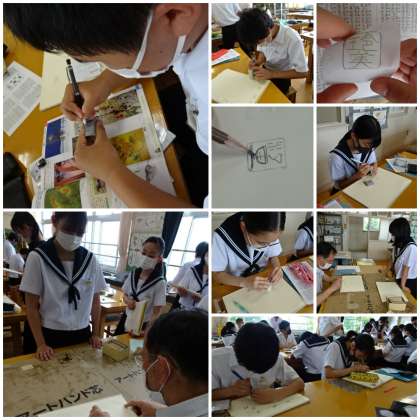 「てん刻」の学習です。名前をデザインした生徒から文字をトレースし、高蝋石の表面に鉛筆で文字をなぞり書きしました。