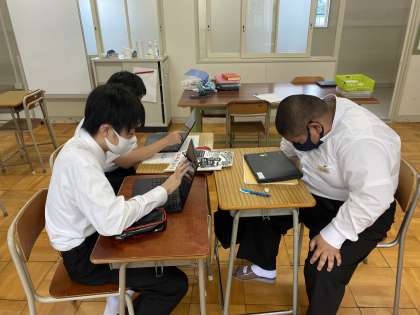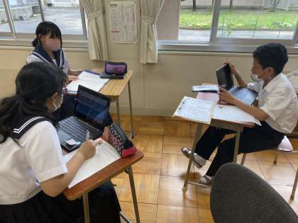 6限の7組の総合の様子です。二手に分かれ、片方のグループはそれぞれ関心のある分野の上級学校について調べました。もう一方のグループはすでに進路学習が進んでいるため、5限に引き続きSDGsの調べ学習を行いました。