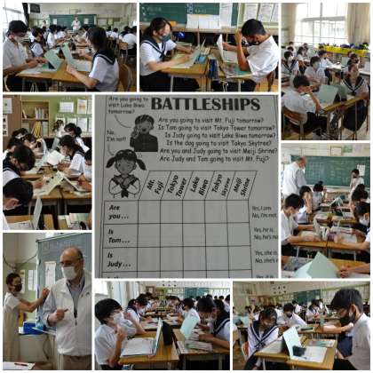 ALTマイケル・グリーン先生の授業です。未来の表現(be going to)を使って、ペアで「BATTTLESHIPS」ゲームに取り組みました。既習事項の復習と英会話を楽しみながら行いました。