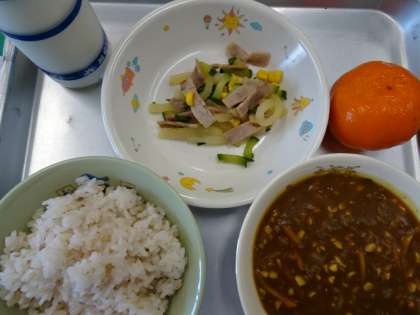今日の給食は、麦ごはん、牛乳、愛知県産大豆のキーマカレー、大根サラダ、冷凍みかんです。