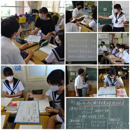「連立方程式の利用」の導入の学習です。問題「シュートのうちわけ」に対し見通しを立て、生徒は、さまざまな方法(「連立方程式」「方程式」「表を使う」「あてはめる」)で答えを導き出しました。もちろん答えはどの解き方でも同じ答えになります。そこで、授業者はそれぞれの解き方のメリット・デメリットをグループで話し合わせ発表させました。