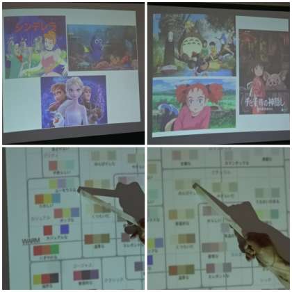 授業の中で、生徒に人気のディズニー、ピクサーやスタジオジブリなどの作品を取り上げ、それぞれの作品の色合いが「配色イメージスケール」から明らかに色合いが違うことを知り、これらの作品が複数の色を組み合わせることで単色より複雑で繊細なイメージの違いを表現していることを理解しました。
