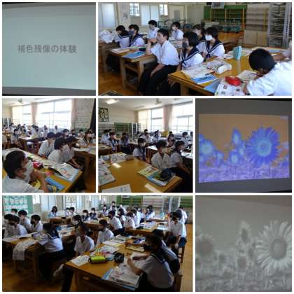 また、授業者は「補色残像」の事例として、高速道路の長いトンネル内で、一定の間隔で「緑」のランプを入れることで、補色残像の効果によって、ブレーキランプの「赤」がより鮮やかに見え、自然とスピードを控える効果があることを伝えていました。