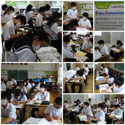 「Unit3 Club Activities」の「part2 Enjoy Commnuication」の学習です。本時は「Key Scentece」の学習後、自分のしたいことや夢を「want to 」を使って書きました。