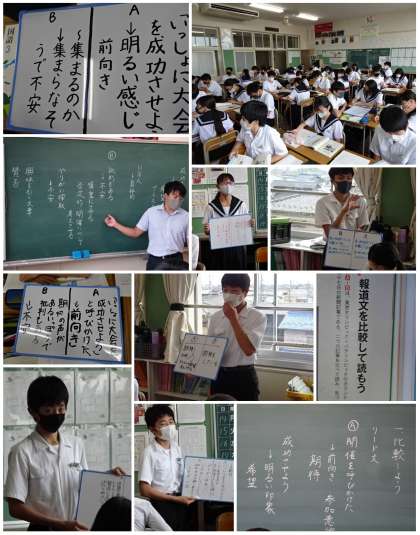「報道文を比較して読もう」の学習です。東京オリンピック・パラリンピック2020のボランティアの募集が始まったことについて報じた2つの新聞記事を比べて読み、気付いたことや考えたことをグループで話し合い、発表しました。