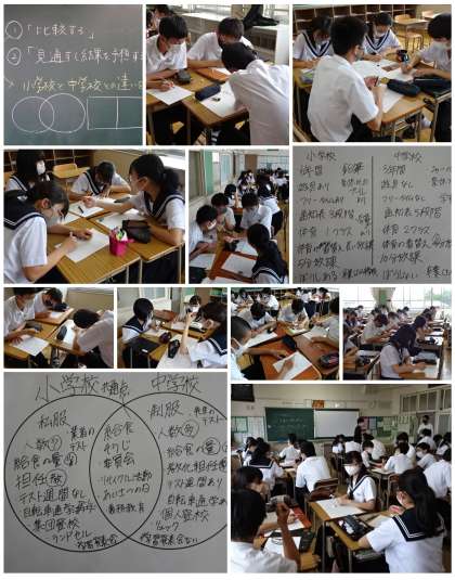 「思考ツールの使い方を考えよう」の学習です。まずウォーミングアップとして、ベン図やIチャートを利用して、「小学校と中学校の違い」を考えました。そして、次のような条件で、カレーの作り方を「矢印と囲い」を使って考えました。