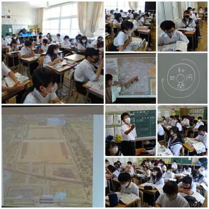 「律令国家の成立と平城京」の学習です。小学校の修学旅行で行った場所の話なので、生徒の食いつきがとてもいいです。平城京の図を見ていて、「右京と左京」が逆であることに気付いたり、都に「市」があることに気付いたりする生徒がいました。授業者は生徒のつぶやきを拾い、授業を進めました。平城宮の跡地の写真を見せたときのことです。ある生徒がその平城宮跡地を東西に横切っている近鉄奈良線の話をしはじめました。級友たちはその話に聞き入り、「なるほど」と拍手をおくっていました。