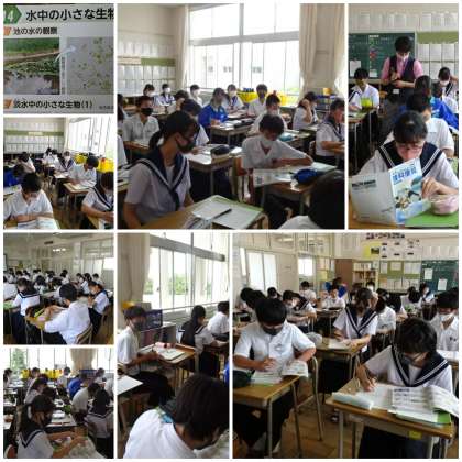 「細胞と生物の体」の学習です。細胞は生物の体をどのように構成しているのかと疑問をもち、単細胞生物と多細胞生物の体のつくりを調べました。生徒が調べている間に私が授業者に「この2つの見分け方は?」とつぶやくと、授業者は単細胞生物と多細胞生物の見分け方を補足していました。さすがは理科の先生です。