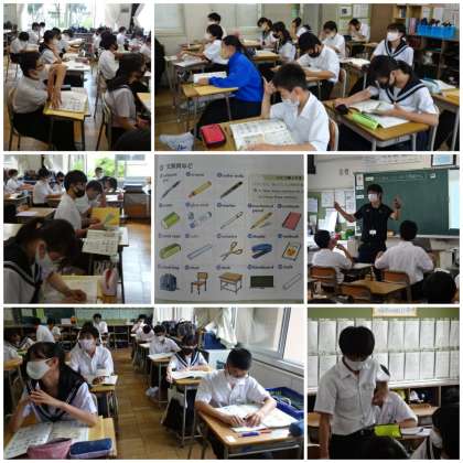 「Unit5 A Japanese Summer Festival」の学習です。「by」「in」「under」「on」など前置詞を使って、「どこにあるか、どこにいるか」を説明できるように学習しました。文房具などの用語を学習し、繰り返し音読し覚えました。
