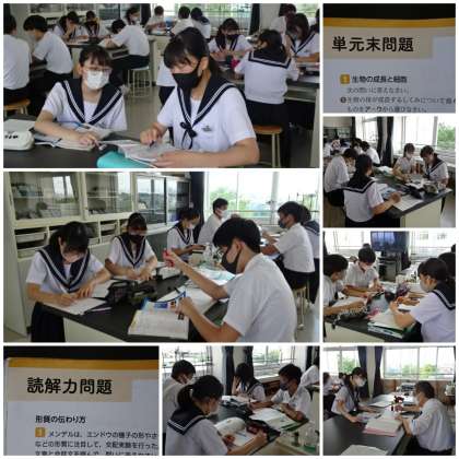 1学期の復習をしています。単元末問題や読解力問題にチャレンジしています。問題をやり終えた生徒から副教材の問題集を行っています。