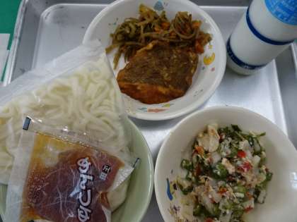 今日の給食は、冷やしうどん、牛乳、白身魚のレモン醤油、ごぼうとゴーヤの甘辛炒めです。