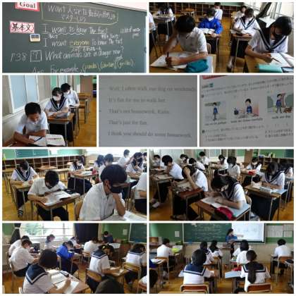 「want+人+to +動詞の原形」「人が〜することを望む、〜してほしい」の構文を押さえたあと、メグと海斗の対話から聞き取った内容についての質問に答えました。
