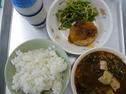 今日の給食は、ごはん、牛乳、愛知のハンバーグおろしソースかけ、十六ささげのあえもの、モロヘイヤのみそ汁です。