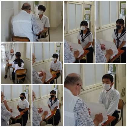ALTのグリーン先生を相手に「speaking」のテストを行っている場面です。生徒らは緊張しながらも、はっきりとした口調で受け答えをしていました。