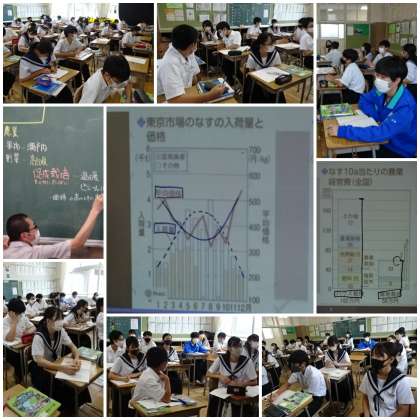授業者は高知県でビニールハウスを利用した野菜の促成栽培を取り上げ、「東京市場のなすの入荷量と価格」を表したグラフから高知のなすがどの時期に出荷されているかを読み取り、「なす10a当たりの農業経営費」を表したグラフから読み取れることとあわせて、促成栽培がこの地域で発展した理由を、他の地域との結び付きに着目して説明できるようにはたらきかけました。