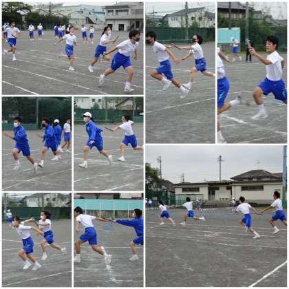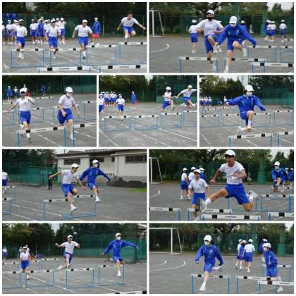 「ハードル走」の授業では、より低い姿勢で抜き足を意識して練習しました。跳ぶというよりか跨いで走り抜けるという感覚が大切です。