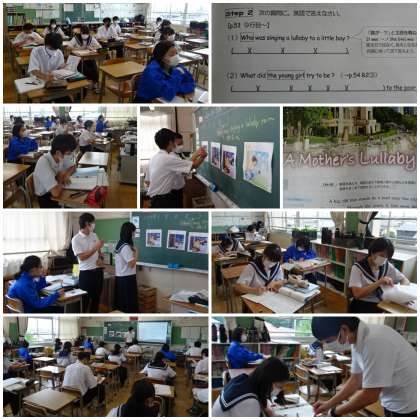 「Let's Read1 A Mother's Lullaby」の学習です。場面の変化や登場人物の心情を理解し、気持ちをこめて音読することが目標です。本時は第2の場面を読み、日本語や英語の質問に答え、場面の理解と登場人物の心情を読み取りました。ここでは「代動詞」についても学習しました。