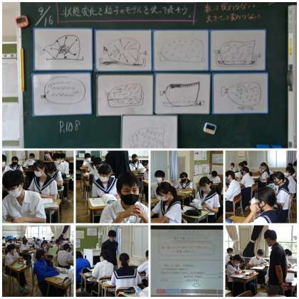「状態変化と粒子の運動」の学習です。袋に入れた液体のエタノールの粒子を●で表します。このエタノールが気体になったときは、どのように表すことができるかグループで考え、ホワイトボードに示しました。固体、液体、気体へと物質が状態変化するとき、粒子の運動はどのようになっているのでしょうか?