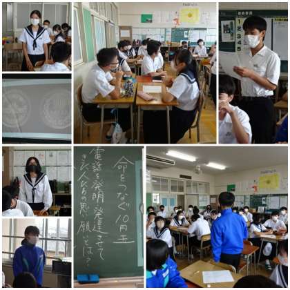 「命をつなぐ十円玉」「誕生日おめでとう」(内容項目:人間愛・思いやり)の学習です。授業者は「わたしの遺産大賞(三井住友信託銀行)作品」「愛のあるメール大賞入選作品」から抜粋したものを教材としました。電話やメールにまつわる温かい実話に触れることを通して、情報機器が開発された意義や使う上で大切にしたいことについて考えました。