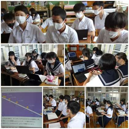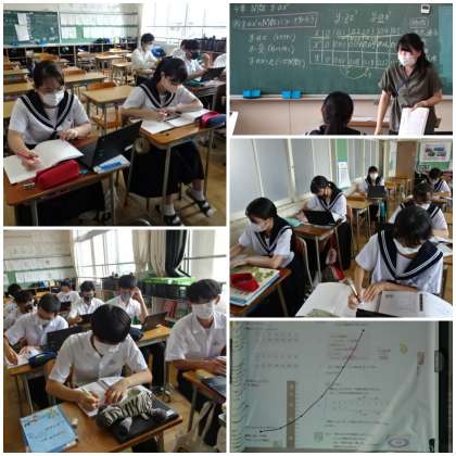 第4章「関数 y=ax^2」の学習です。生徒はこれまでに、中1で比例y=ax、反比例y=a/x、中2では一次関数y=ax+bを学んできました。中3のここでは、関数y=ax^2、高1ではy=ax^2+bx+cを学習します。本時は斜面にボールを転がして、転がり始めてからの時間xとその間に転がる距離yの間にどんな関係があるかを考え、グラフにしました。