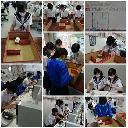 「計測・制御の技術」の学習です。技術科ではプログラミングを通して「ロボットカー」を動かしています。本時は「自動走行プログラムを作成しよう」を学習課題として、壁に当たらないように前へ進むプログラミングをします。仲間との情報交換を基に問題解決をするためにうまくプログラミングができたでしょうか?