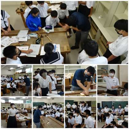 「材料と加工の技術」の学習です。くぎ接合に必要な工具を知り、その使い方について教師の演示を観察しました。本時では「げんのう」と「四ツ目ぎり」の使い方を学びました。今後、個々に練習し、木材加工につなげていきます。