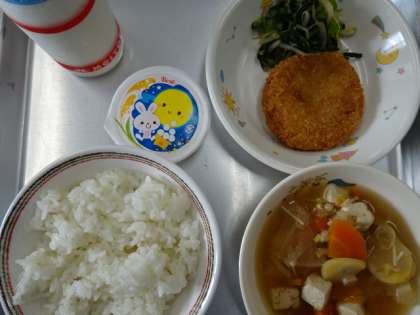 今日の給食は、ごはん、牛乳、さといもコロッケ、小松菜のおひたし、十五夜汁、お月見ゼリーです。