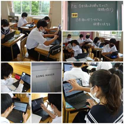 「日本語の抑揚を生かした旋律を作ろう」の学習です。七五調の言葉を自然な日本語の発音に合うようにリズムを工夫して作りました。今回は音の高さを「ミ」「ソ」「ラ」の3音に設定し、楽譜に記しました。「SONG MAKER」というソフトを使って自分たちが作曲したリズムを確認していました。