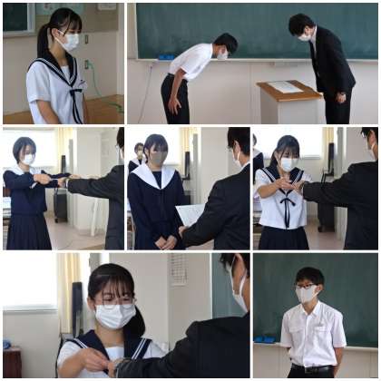 校長より任命証を、学級委員代表、生徒会議員代表、学級書記代表、委員長代表の順に手渡しました。