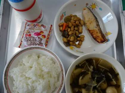 今日の給食は、ごはん、牛乳、サケの塩麹焼き、五目豆煮、十三夜汁、サツマイモと栗のタルトです。