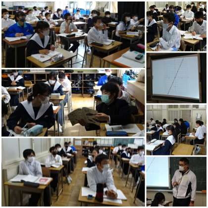 「比例のグラフ」の学習です。y=axで、対応するxとyの値を求め、グラフに点を落としてグラフをかきました。比例定数aが負の値の場合についても調べ、グラフにかきました。これらのことから、y=axのグラフが原点を通る直線であることが分かりました。