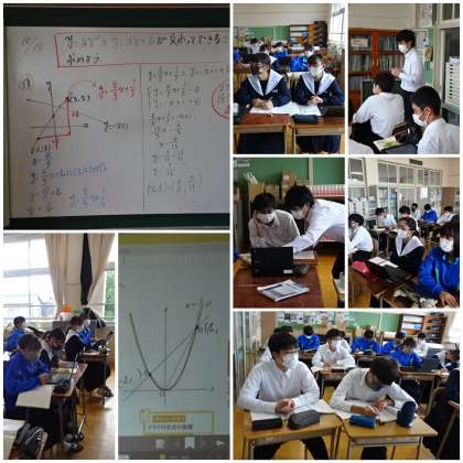 「いろいろな事象と関数」の学習です。本時はy=ax^2とy=ax+bが交わってできる三角形の面積をどのように求めるか考えました。生徒は、交点のx座標、y座標は二つの関数の連立方程式の解で求められることを利用して考えました。三角形の底辺をどこにとるかがポイントです。