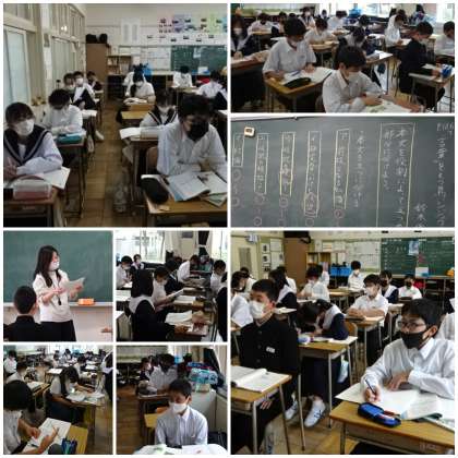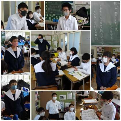 「『言葉』をもつ鳥、シジュウカラ」の学習です。本文を読み、文章の構成と内容を捉えていきます。本文を「役割」によって五つの部分に分け、形式段落が「役割」のどこに分けられるか、グループで意見交流を行い、ホワイトボードにまとめ、発表しました。