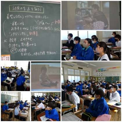 「幼児の一日の生活」の学習です。幼児の一日の生活を知り、その特徴や中学生との違いについて映像を視聴しながら考えました。生徒は、映像による幼児の観察を通して、幼児の生活を理解しようとしていました。