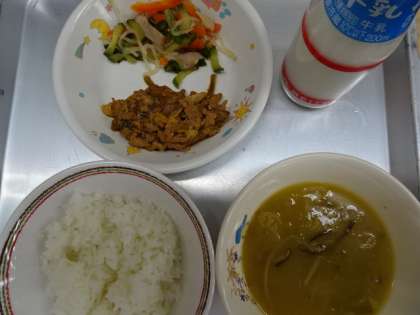 今日の給食は、ごはん、牛乳、回鍋肉、バンサンスー、中華風コーンスープです。